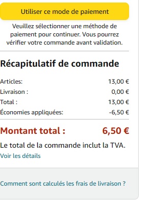 Tout d’abord, coche le -50%, ensuite valide ton adresse, et lorsque tu passera a l’Ă©tape de validation du moyen de paiement, le prix de 6,50⏠apparaitra ^^