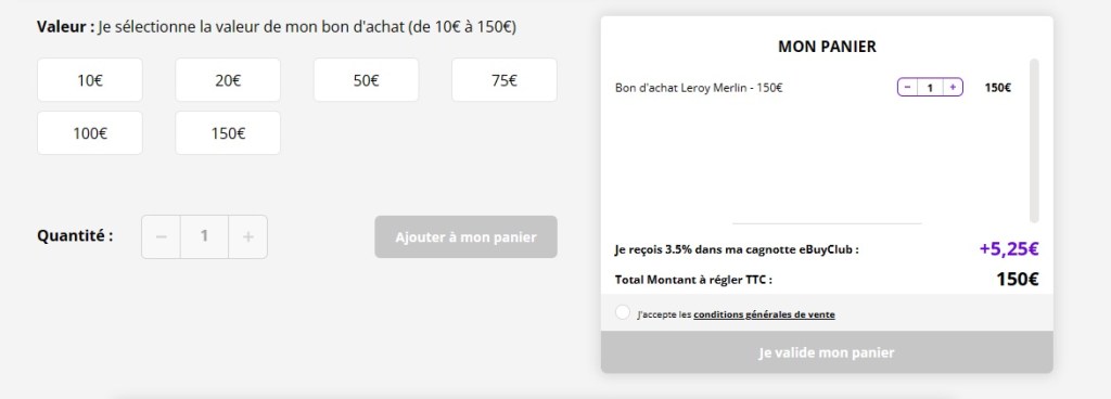 Exemple : acheter une carte cadeau Leroy Merlin de 150⏠vous aurez immédiatement 5.25⏠remboursé dans votre cagnotte.