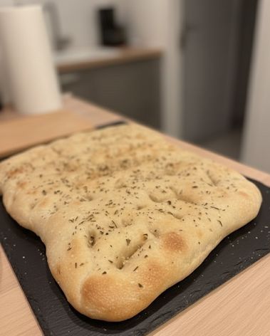 5. Cuisson PrĂ©chauffer four Ă 220^{\circ}C. Verser gĂ©nĂ©reusement l’huile d’olive. Faire les « puits » (dimples) avec les doigts. Parsemer de sel et romarin. Enfourner pour 20-25 minutes.
