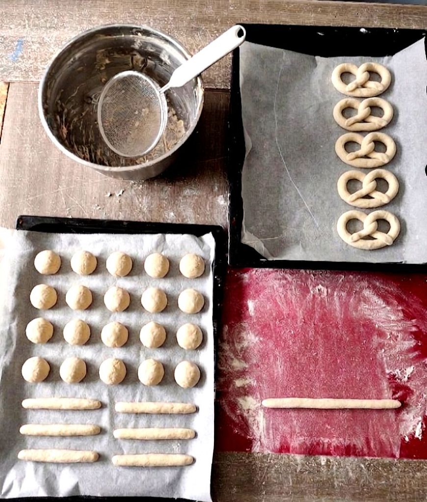 DĂ©gaze la pĂąte puis roule‑la en un long boudin. Forme un grand U, croise les deux extrĂ©mitĂ©s deux fois, puis rabats-les vers le bas pour obtenir la forme du bretzel.
